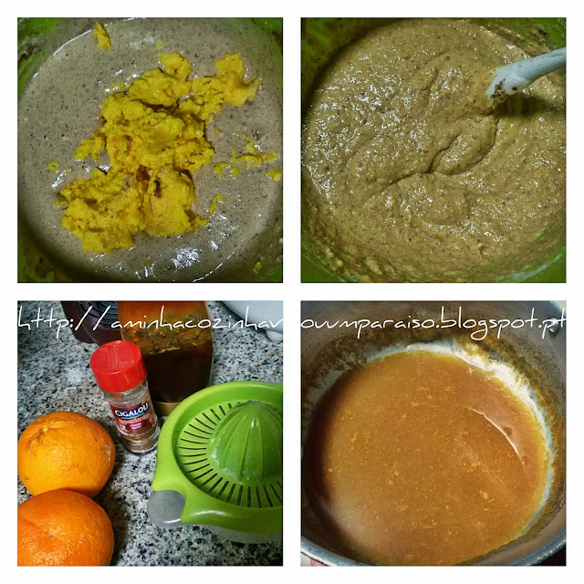 4. Adiciona-se o "puré" feito com a laranja e com o gengibre à massa do bolo e envolve-se tudo muito bem.