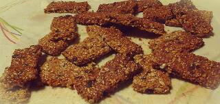 Colocam-se todos os intregientes secos misturados num recipiente. Em seguida verte-se para cima dos mesmos o mel, o ovo e a clara. Envolve-se tudo muito bem e no final dispoem-se o preparado de forma rectangular com uma altura uniforme num tabuleiro forrado com papel vegetal. Leva-se ao forno pré-aquecido a 225○ durante cerca de 30 minutos.